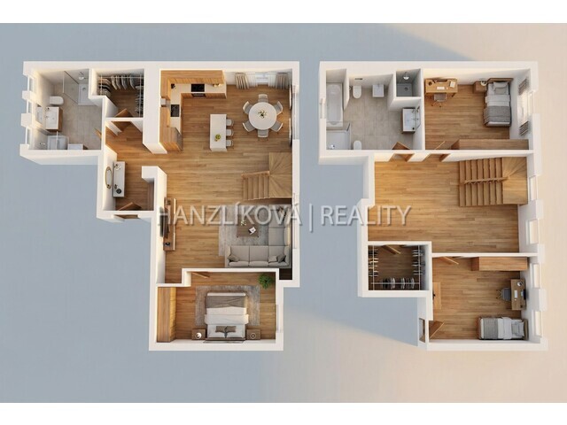 Byt je řešen jako prostorný mezonet, který nabízí příjemné oddělení